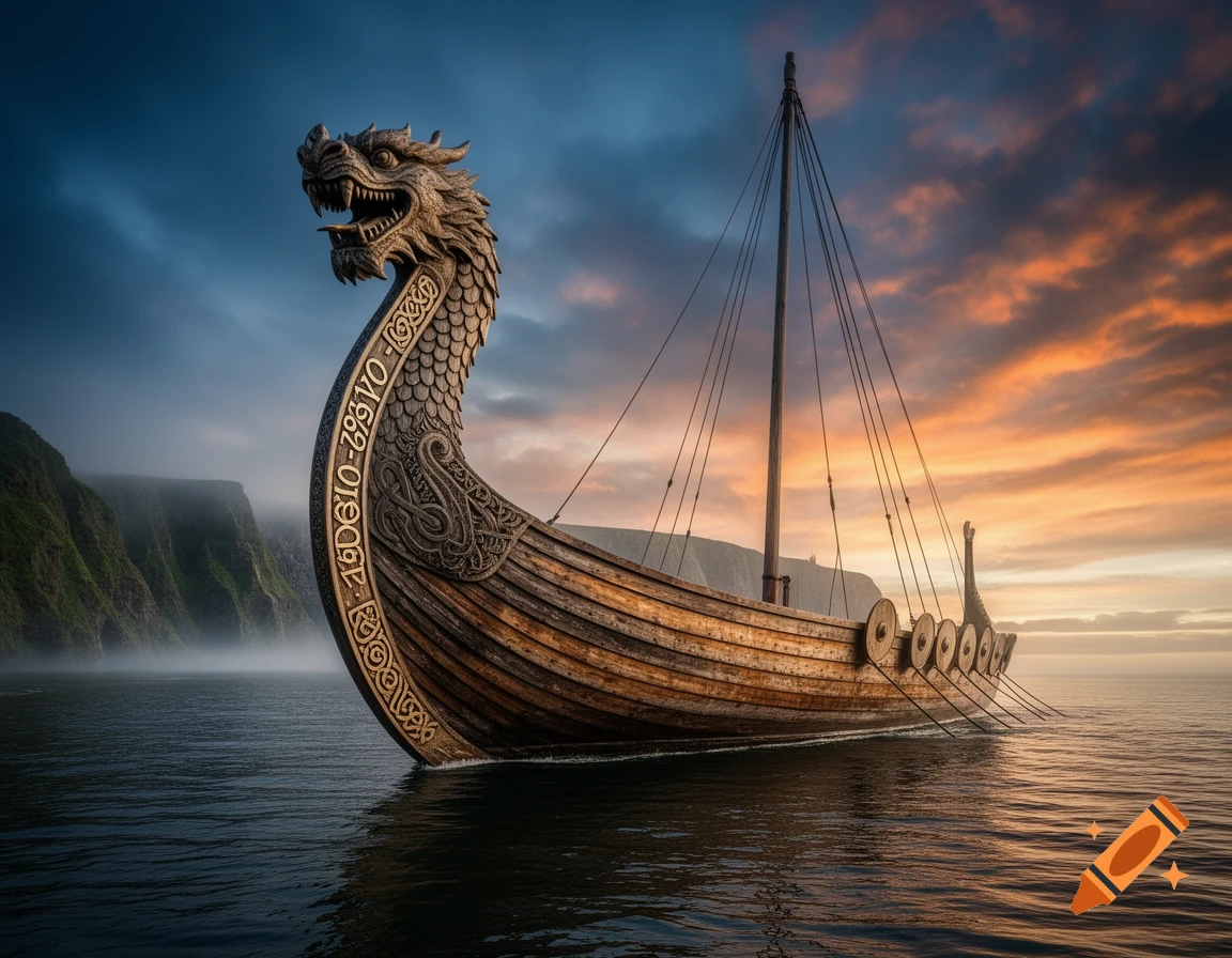 A photorealistic image of a Viking longship with a dragon head ...