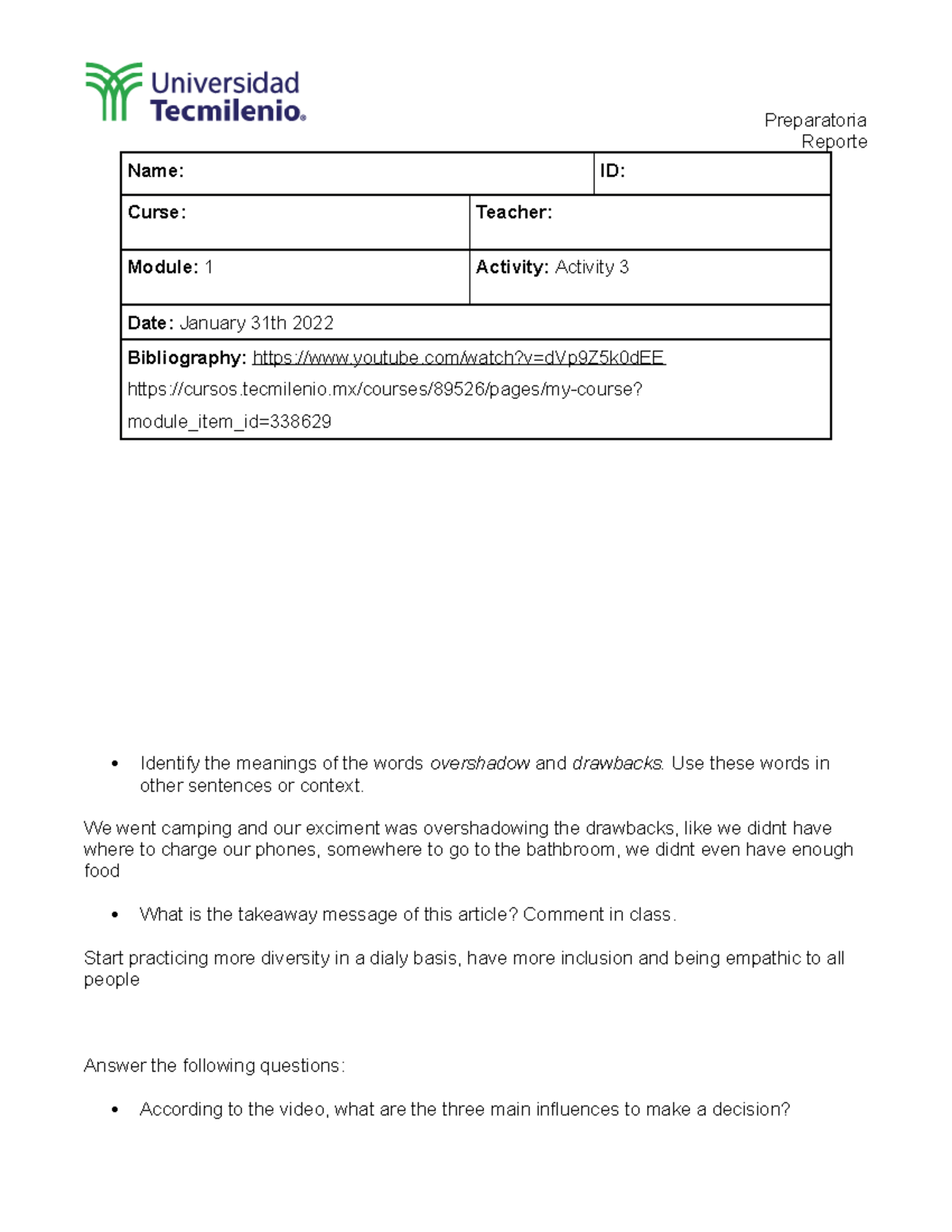 Activity 3 - • Identify the meanings of the words overshadow and ...