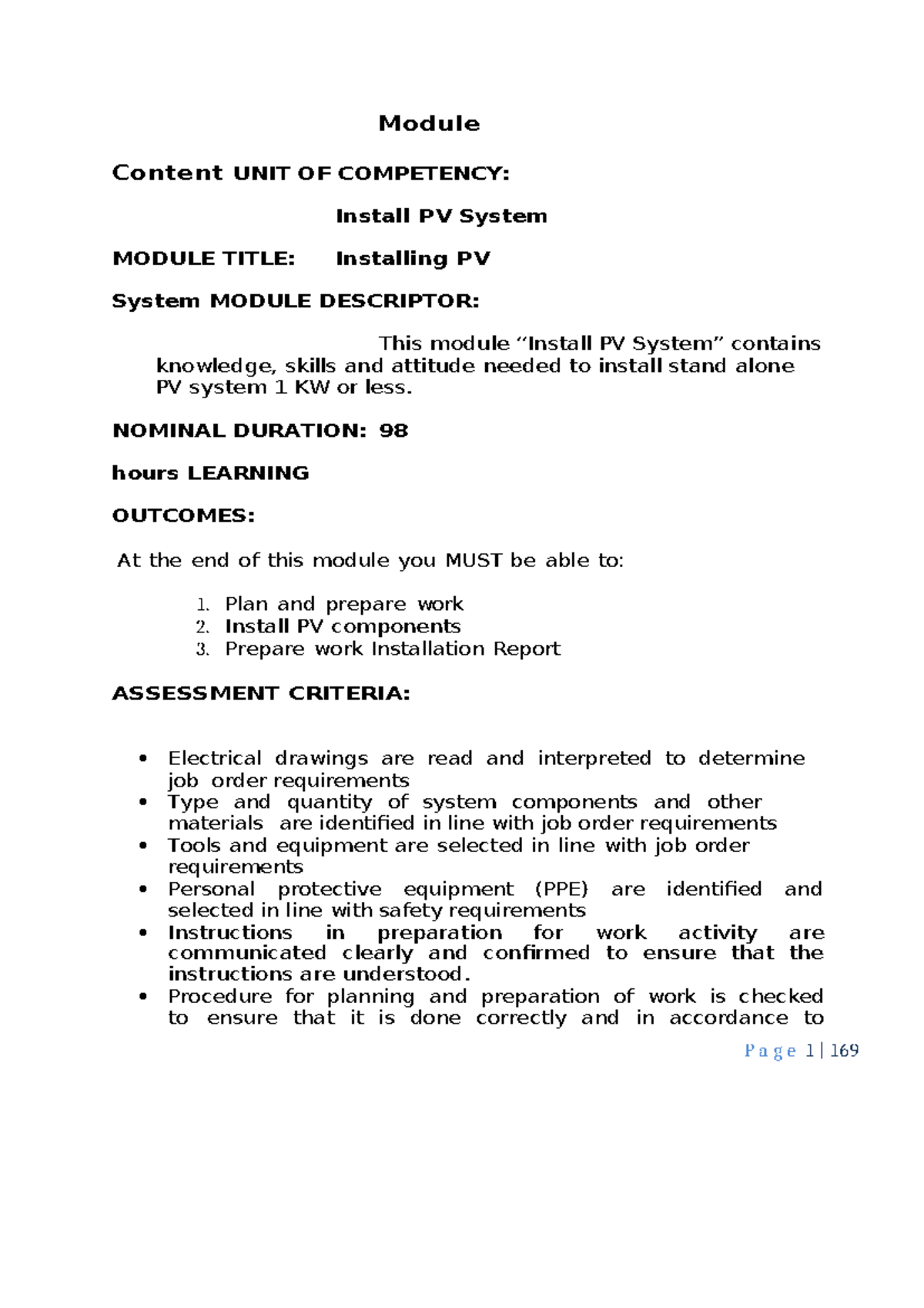 Installing PV System (CBLM) - Module Content and Learning Outcomes ...