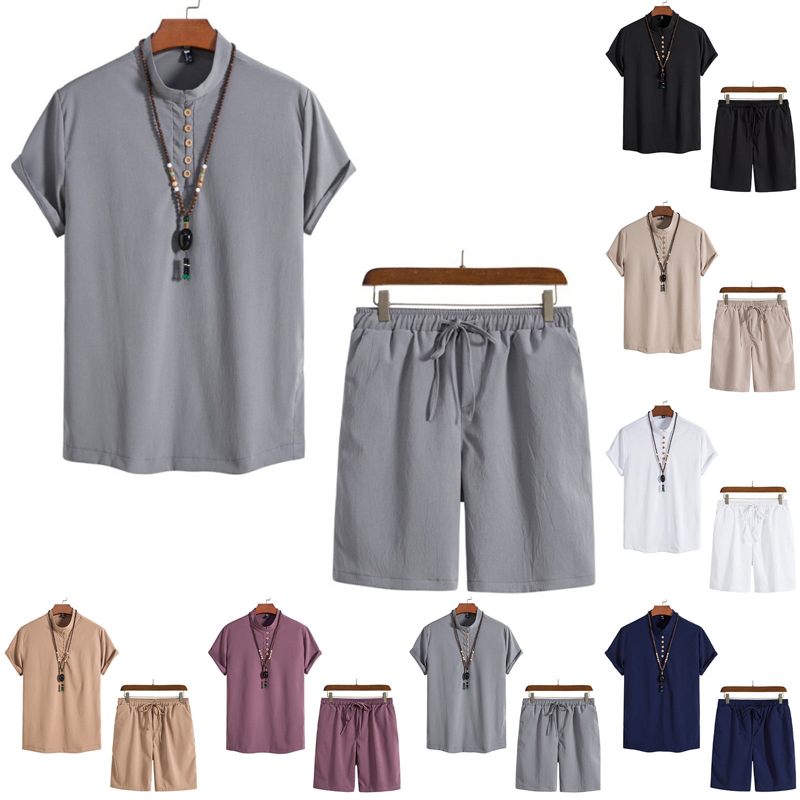 srobpty Mens Summer 2 Piece Set Solid Button Drawstring Stand Collar ...