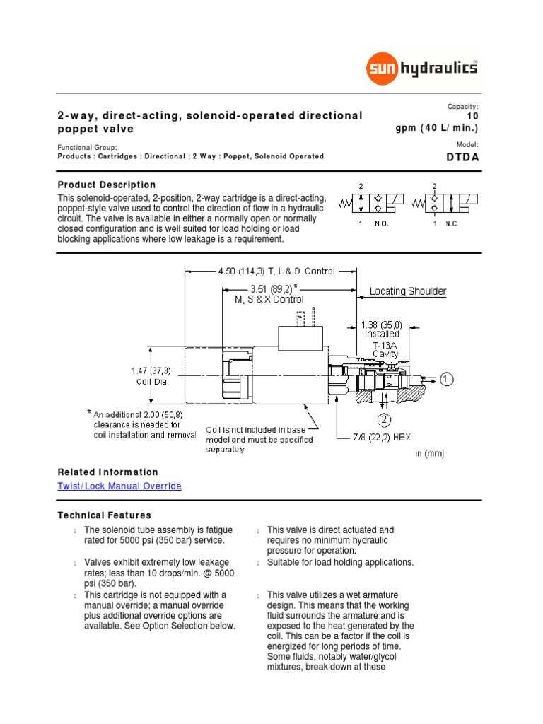 Sun Hydraulics DTDA-MHN, 2-way, Solenoid-Operated Directional Poppet ...