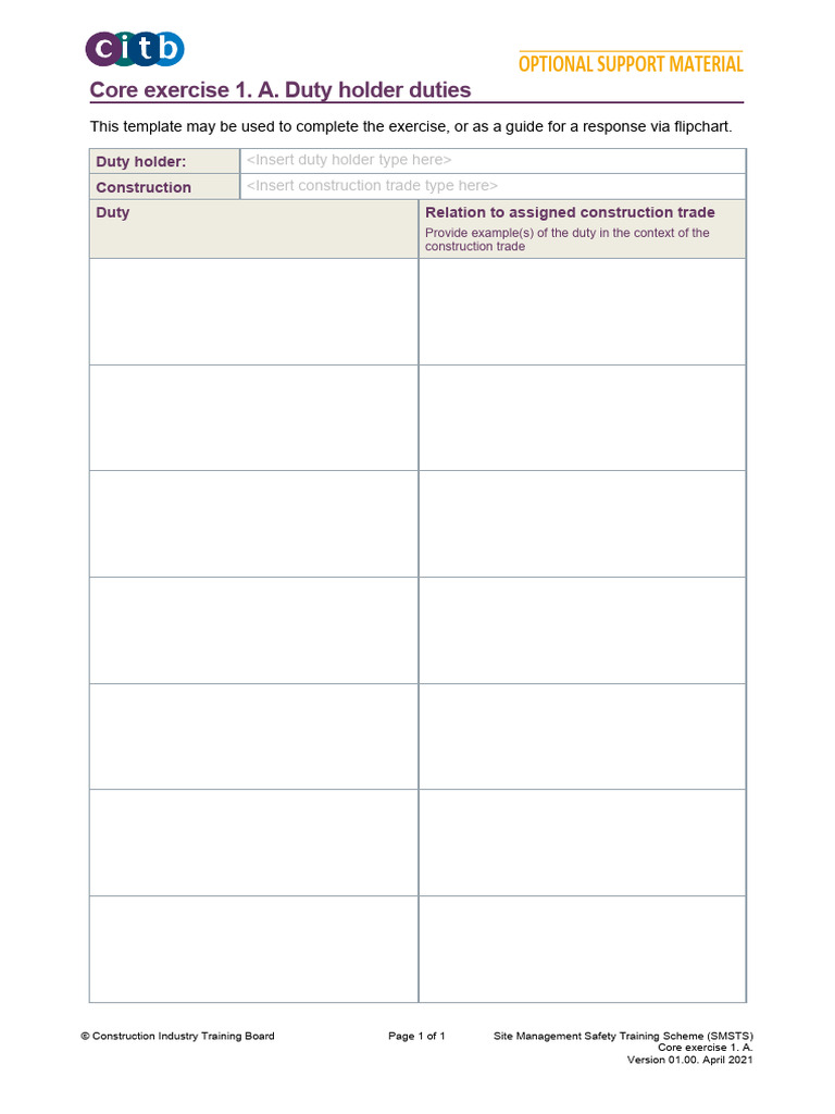 SMSTS - Core Exercise 1 - A - Duty Holder Duties Template - v01.00 | PDF