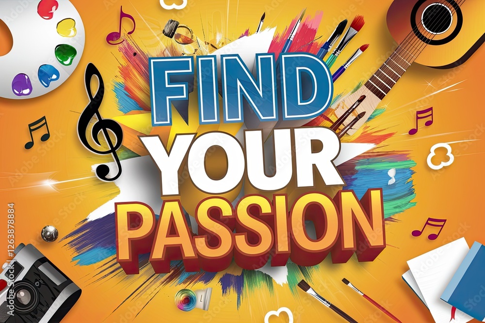 Dynamic graphic design with 3D text "Find Your Passion," featuring art ...
