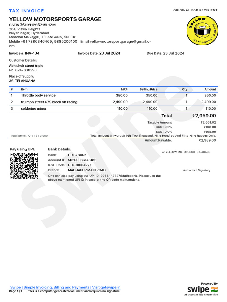 Invoice-YELLOW MOTORSPORT GARAGE-INV-134 | PDF | Payments