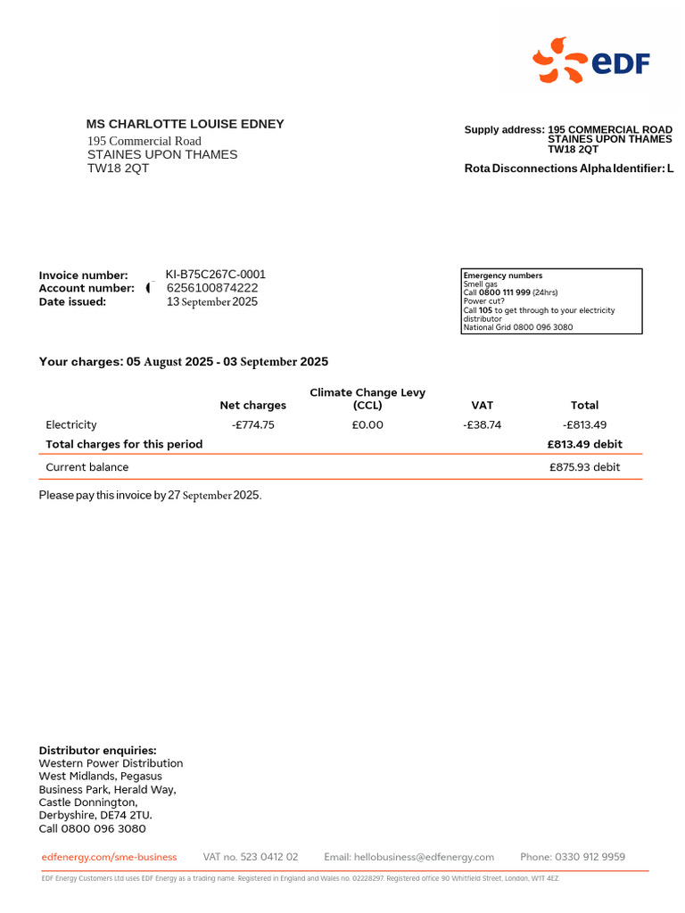 EDF (UK) business utility bill, Word and PDF template