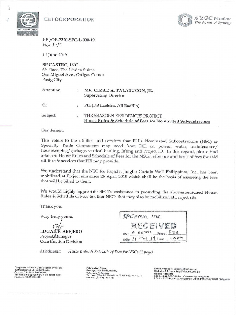 EEI House Rules and Schedule of Fees To Contractors - Cash Bond | PDF