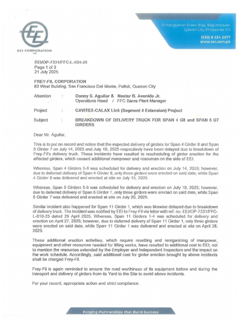 EEI-OP-7331-FFC-L-024-25 Breakdown of Delivery Truck For Span 4 and 5 | PDF