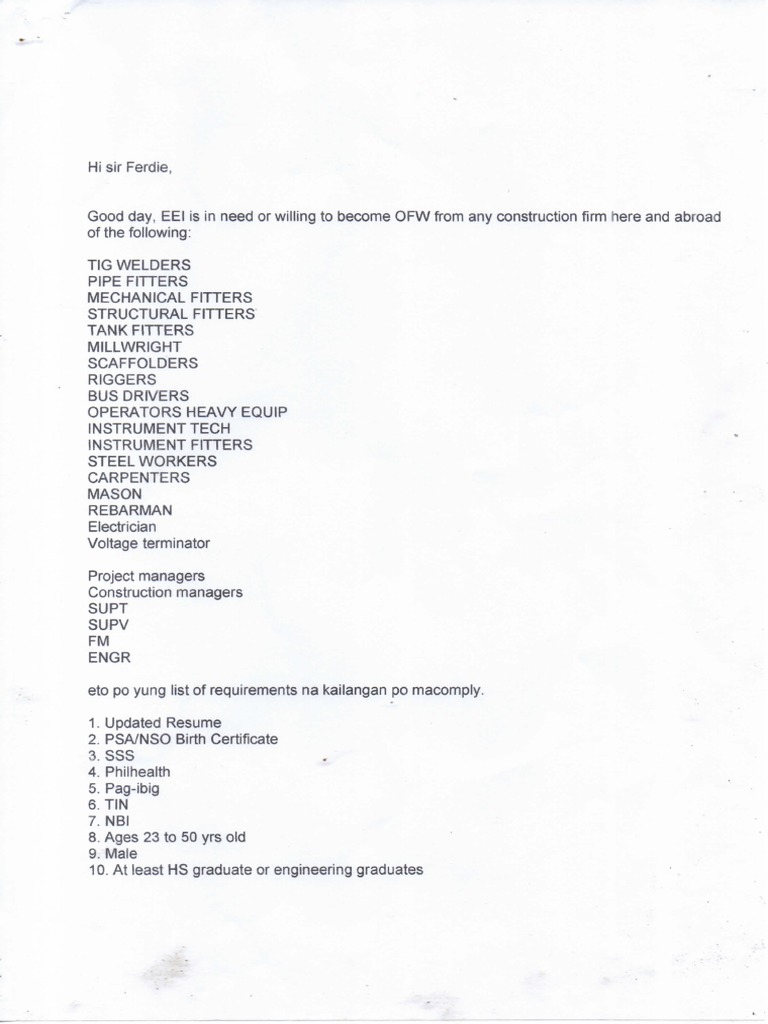 EEI List of Employment Sent To Mr. Ferdie | PDF