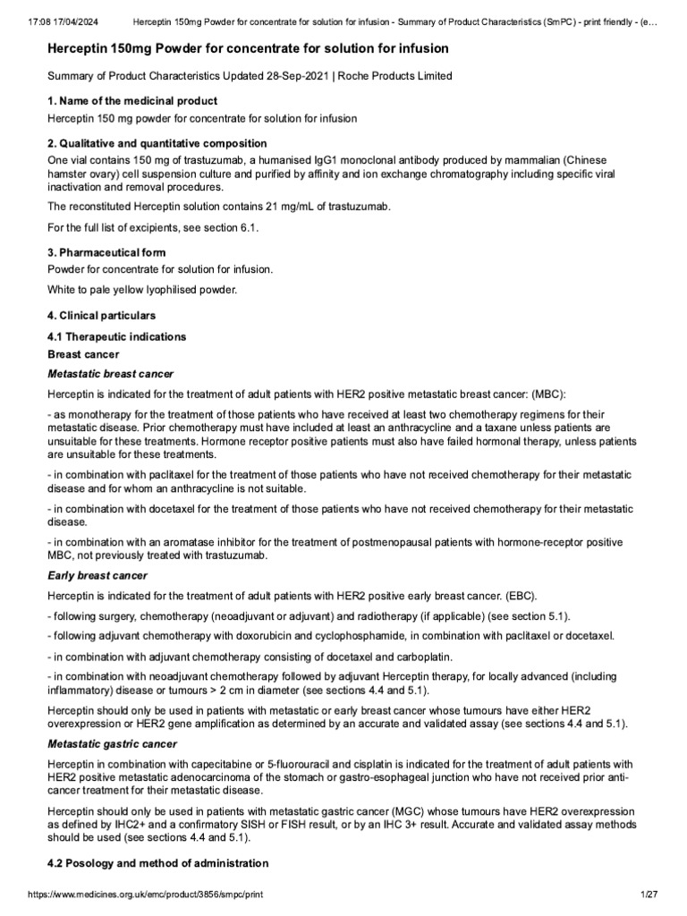 Herceptin 150mg Powder For Concentrate (EMC SMPC) | PDF