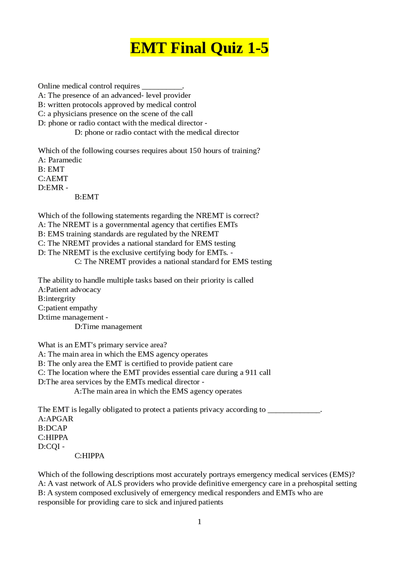 EMT BASIC EXAM 1, 2, 3, 4, & EMT BASIC PRACTICE EXAM 1, 2, 3, 4, Merged ...