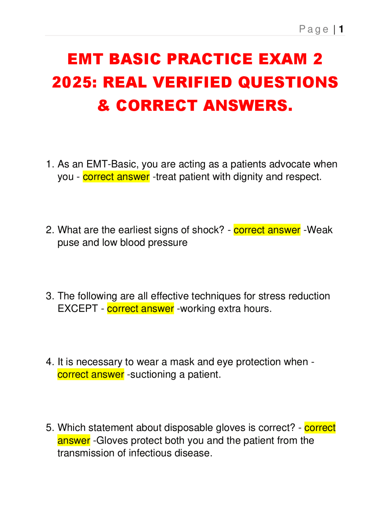 EMT BASIC PRACTICE EXAM 1 QUESTIONS WITH CORRECT ANSWERS - EMT - Stuvia US