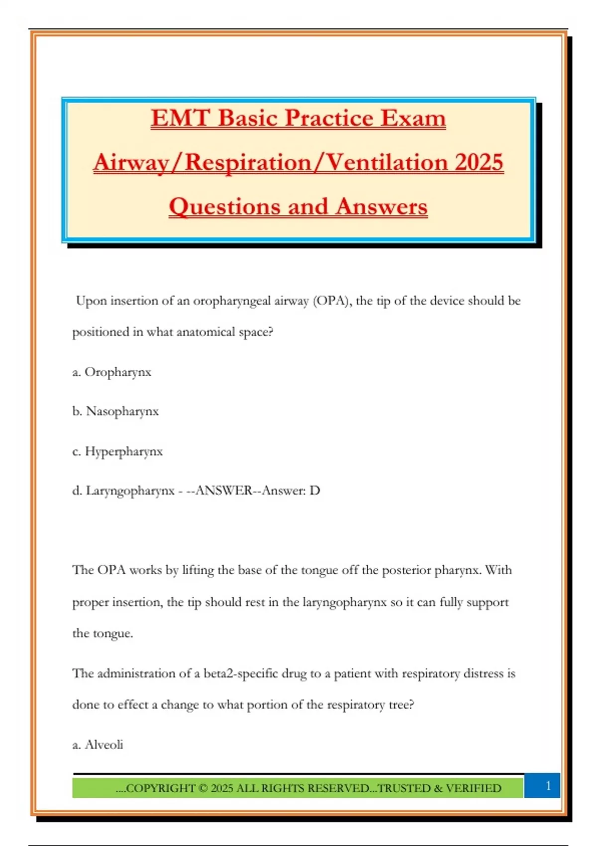 EMT Basic Practice Exam Airway/Respiration/Ventilation Questions and ...