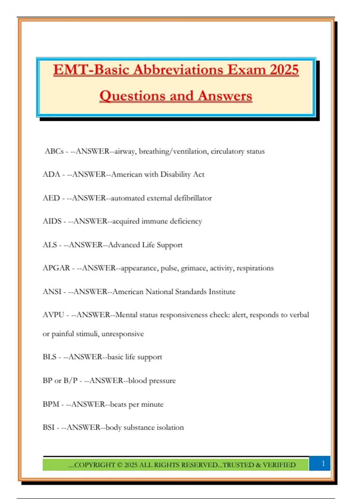 EMT-Basic Abbreviations Exam 2025 Questions and Answers - EMT - Stuvia US