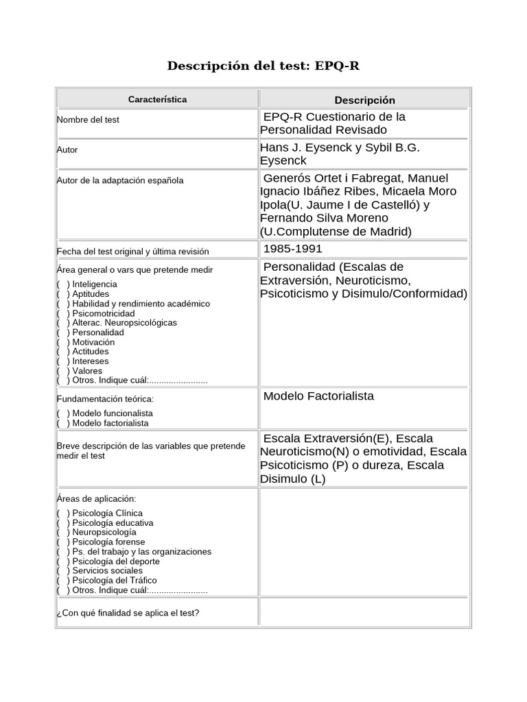 EPQ R Cuestionario y plantilla Eysenck con autocorrección - Psicologia ...
