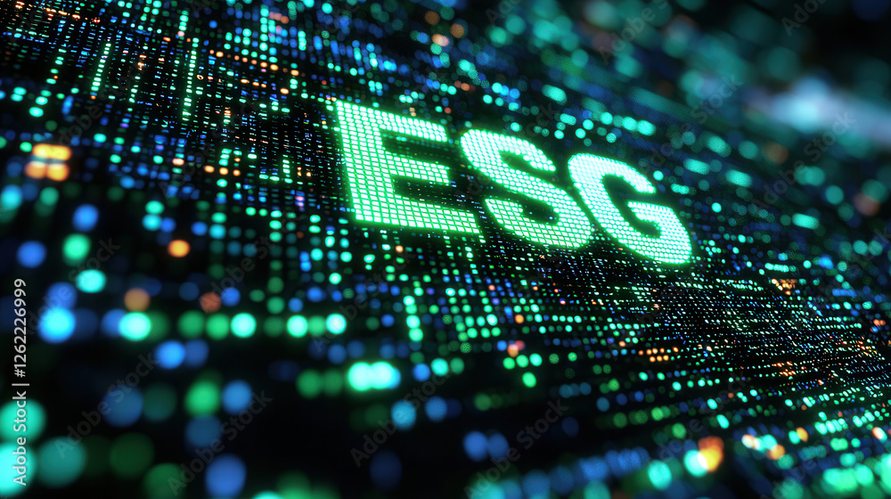 ESG highlighted in green on digital background with glowing dots ...