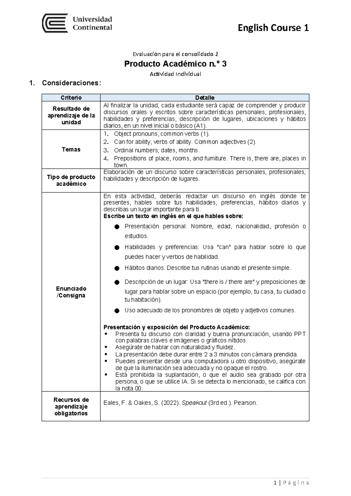 English Course 1 - Evaluación Producto Académico 3: Discurso Oral A1 ...