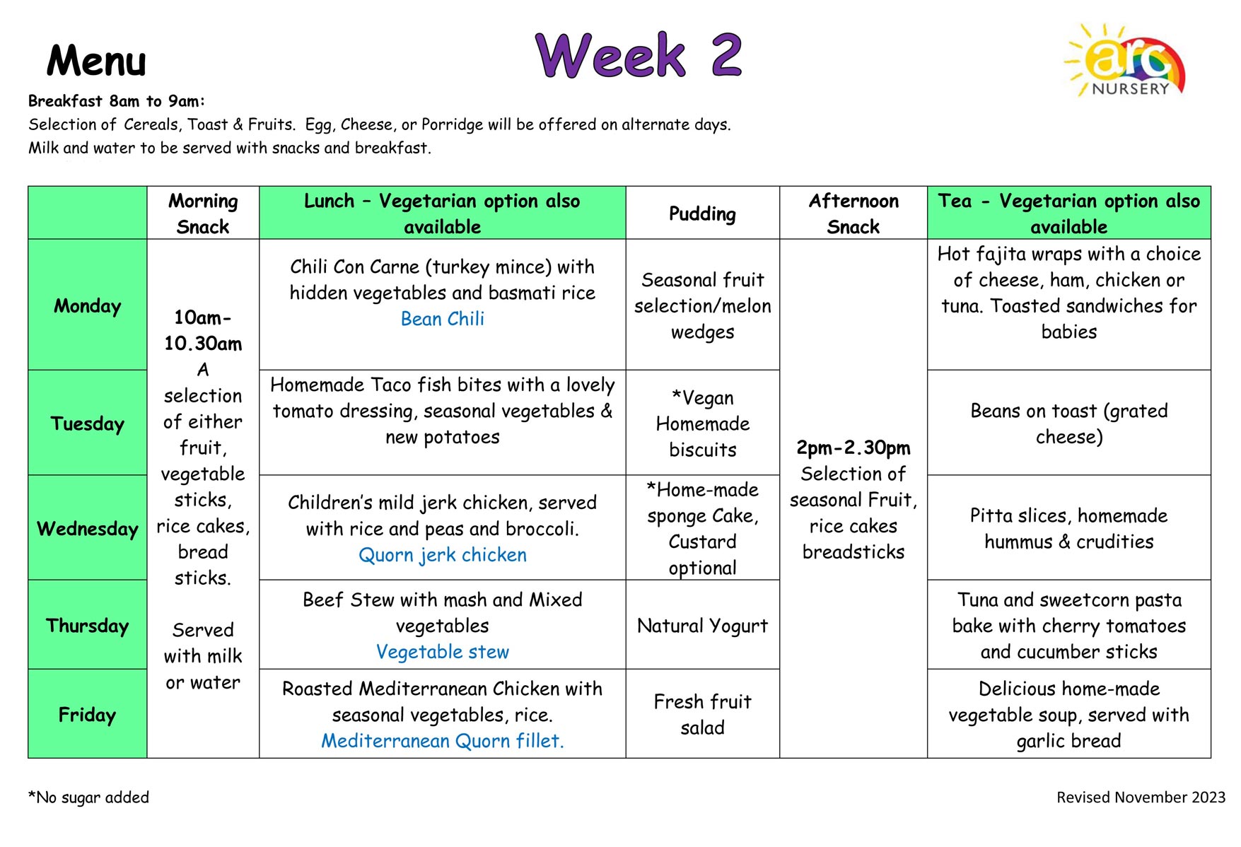Arc Nursery Menu Examples for Breakfast, Lunch, Tea and Snacks