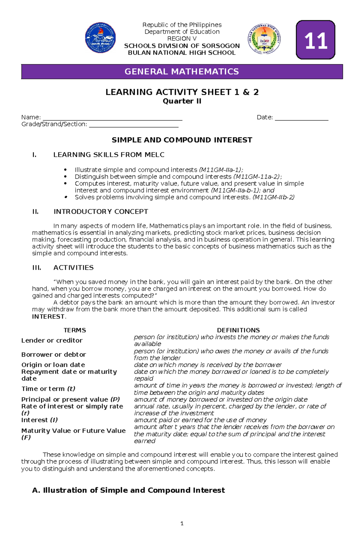 LAS Gen Math Week 12 Q2: Simple and Compound Interest Activities - Studocu