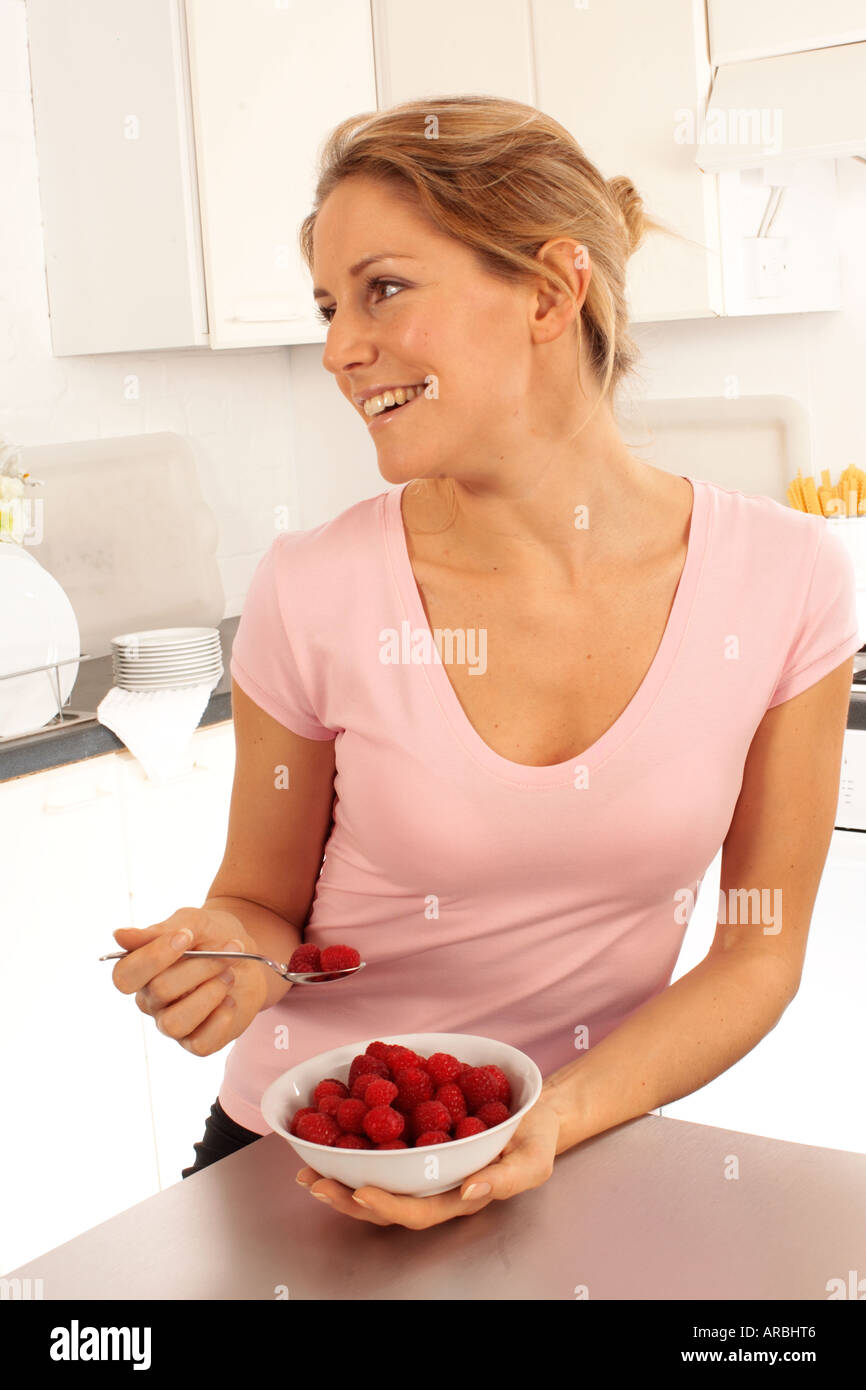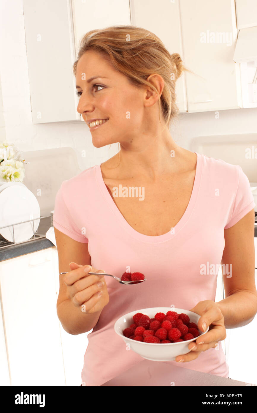 young beautiful woman eating raspberries Stock Photo - Alamy