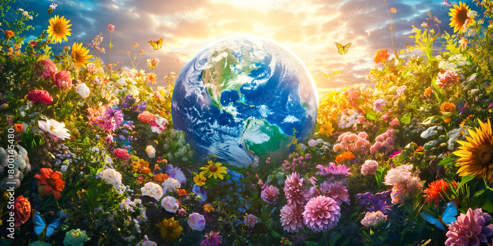 Earth nestles in a lush field of vibrant blooms, symbolizing unity and ...