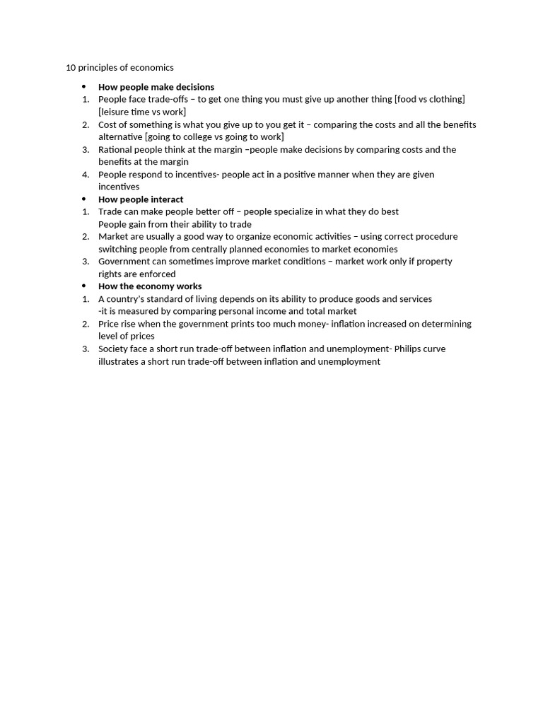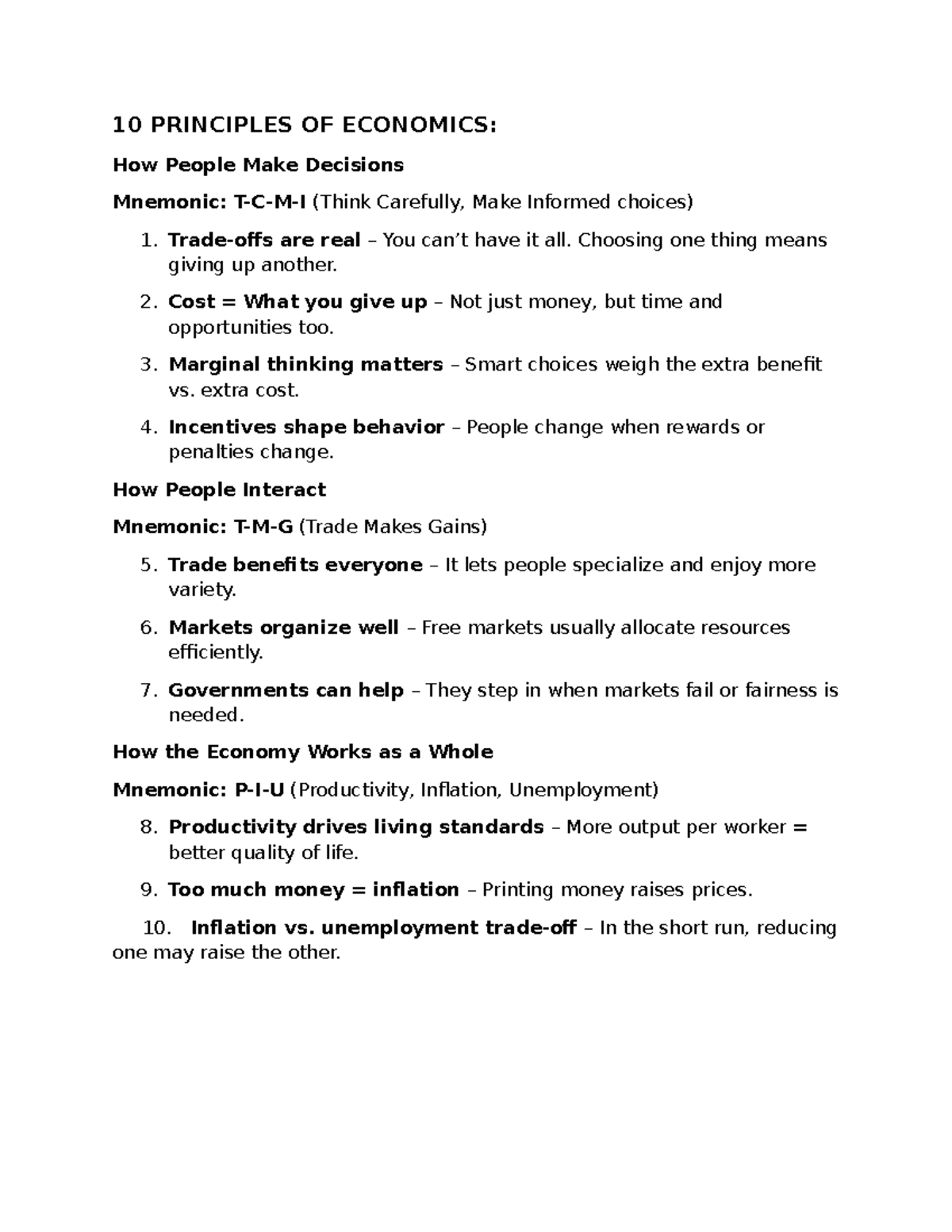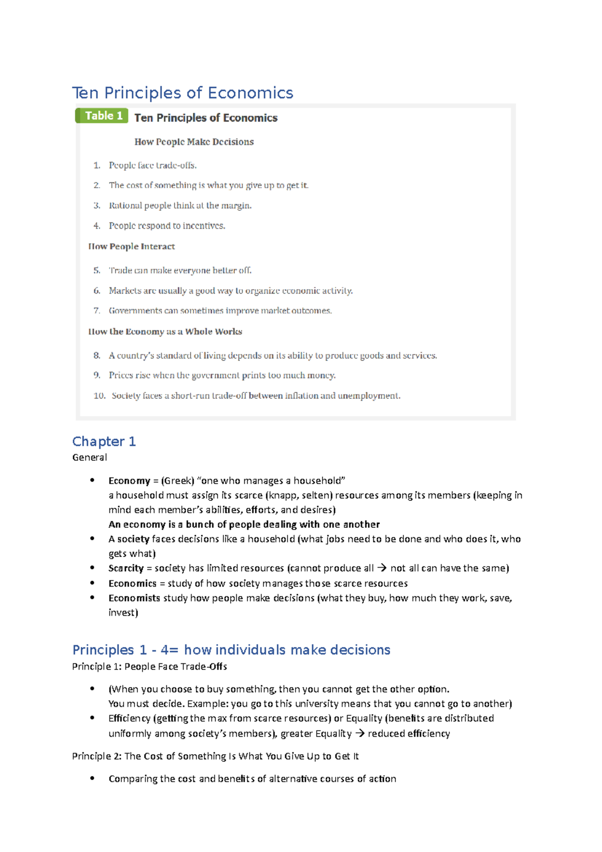 Ten Principles of Economics, short note | Cheat Sheet Economics | Docsity