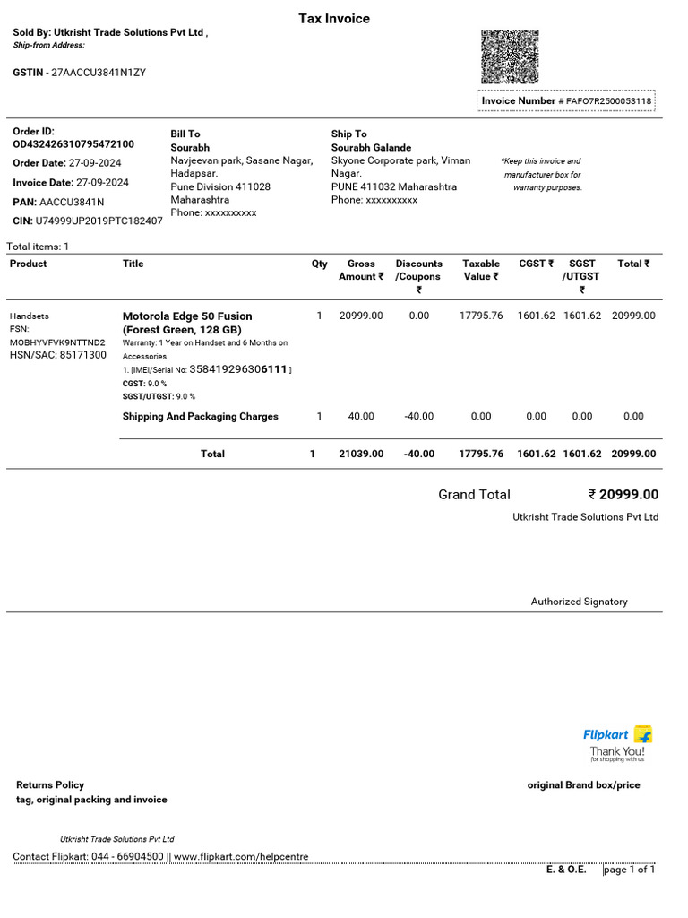 Invoice for Motorola Edge 50 Purchase | PDF