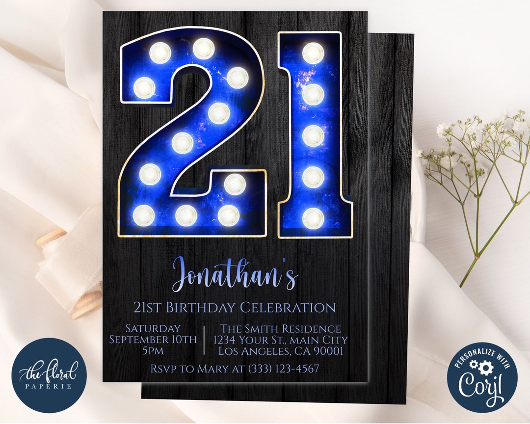 Editable 21st Birthday Invitation Template, Blue Marquee Lights ...