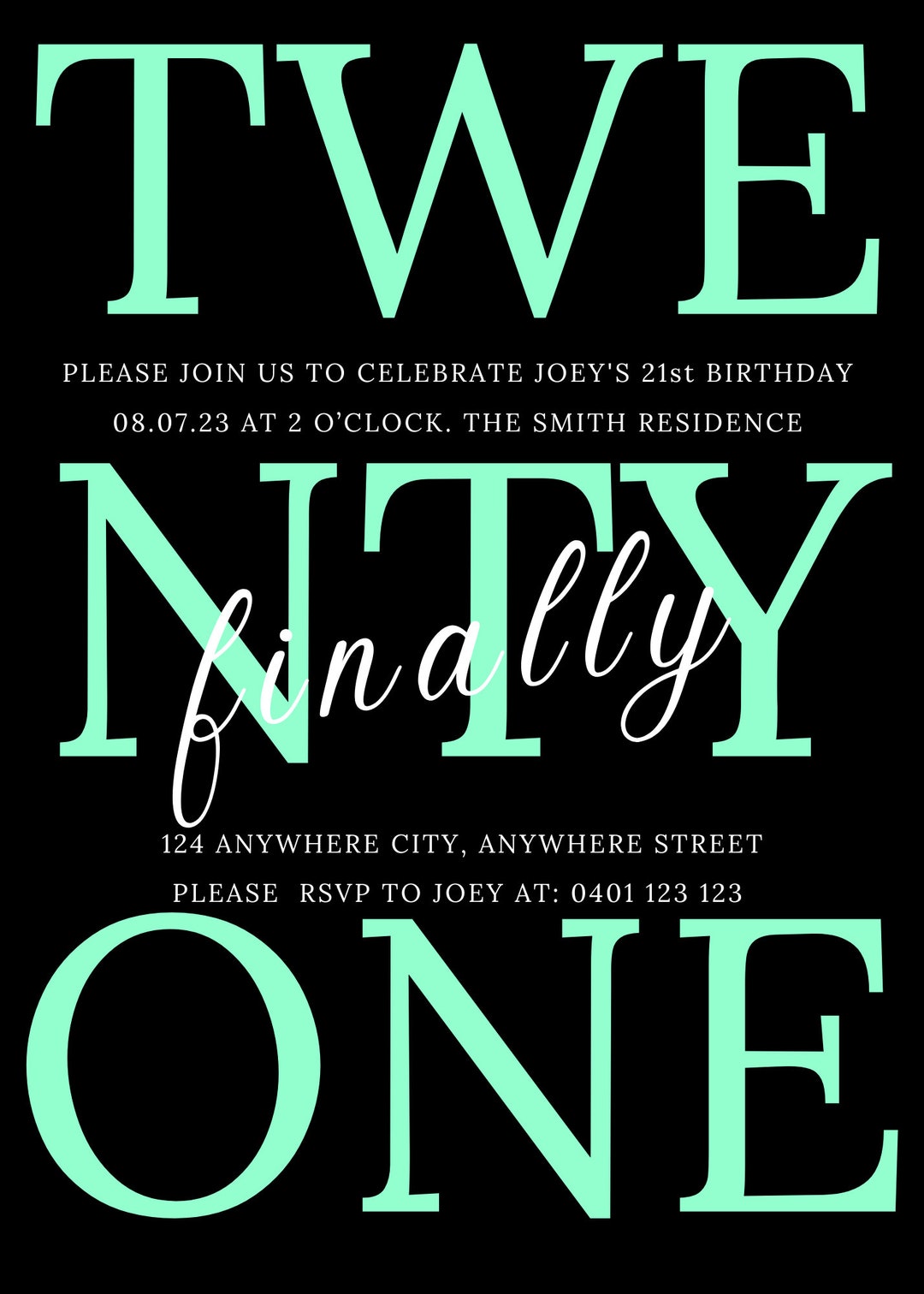 Editable 21st Birthday Party Invitation Card, Modern Twenty One Invite ...