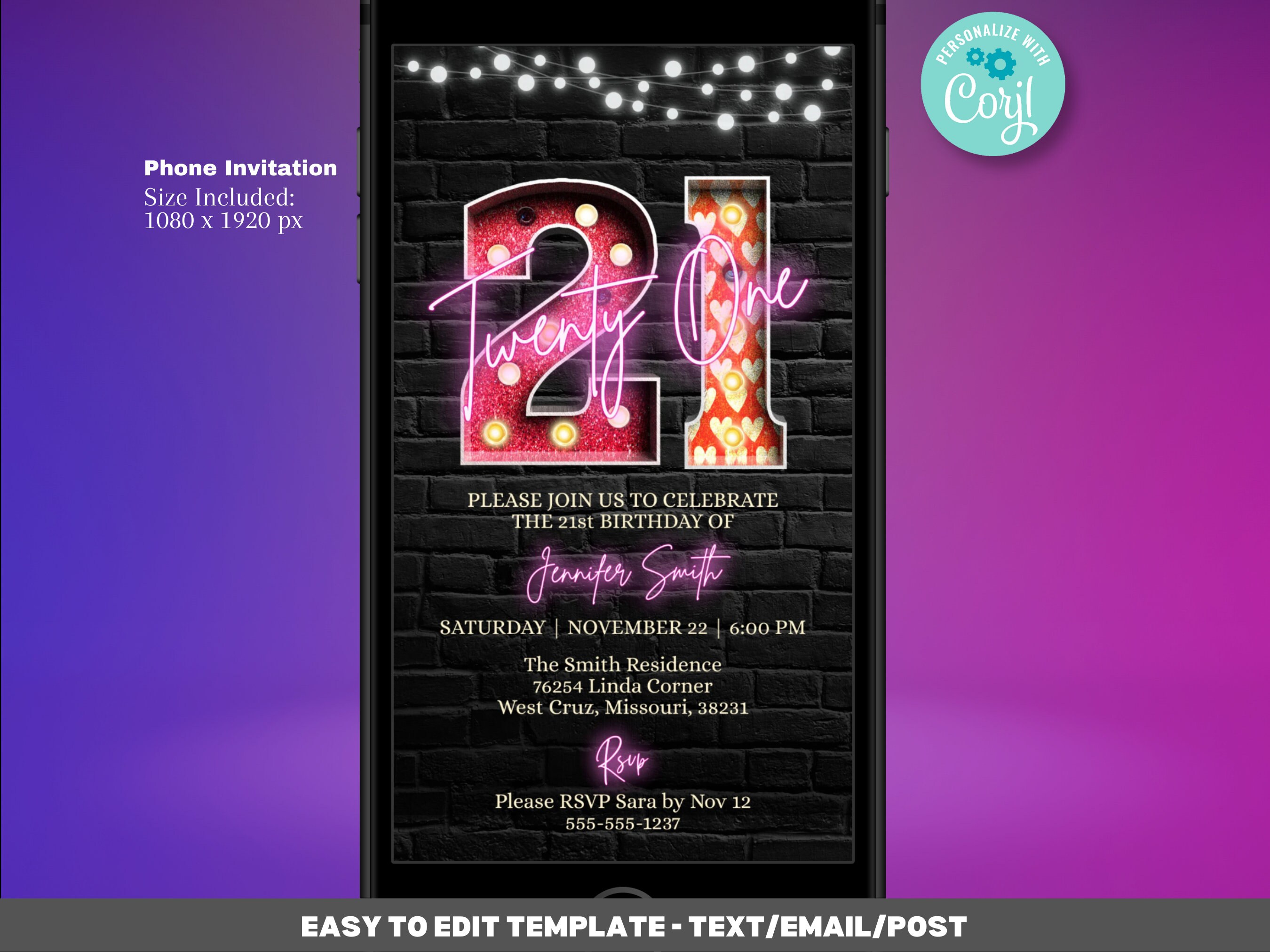 Editable 21st Birthday Invitation Template Digital Marquee - Etsy
