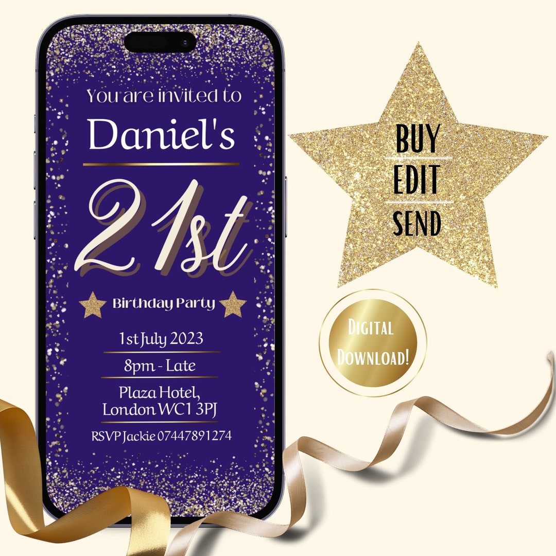 21st Birthday Party Invitation, Dark Blue, Editable Template (digital ...