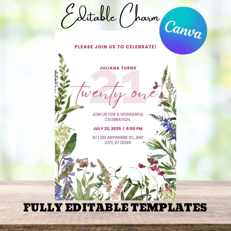 Editable 21st Birthday Invitation Template, Printable Wildflowers ...