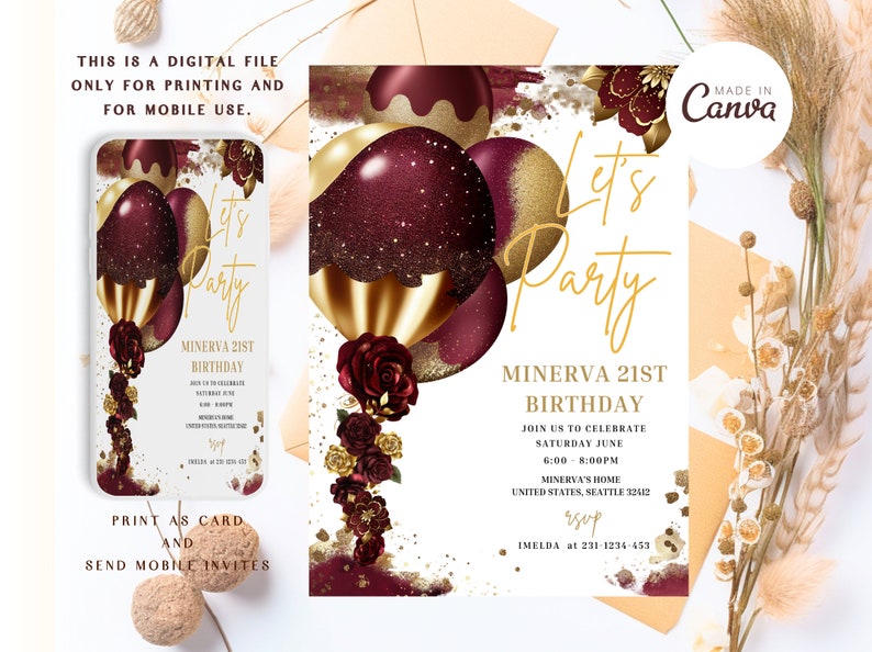 Burgundy birthday invitation editable 21st birthday invite edit in ...