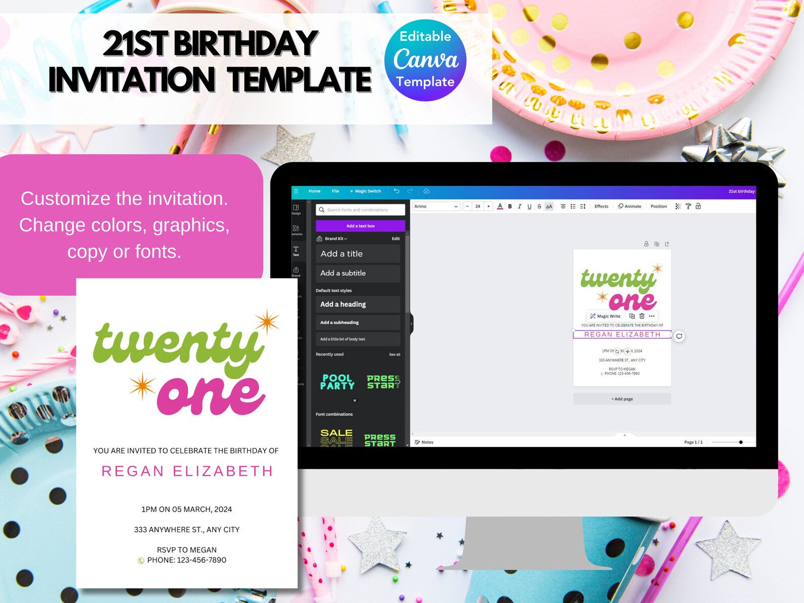 Custom 21st Birthday Invitation Template: Editable Canva Digital ...