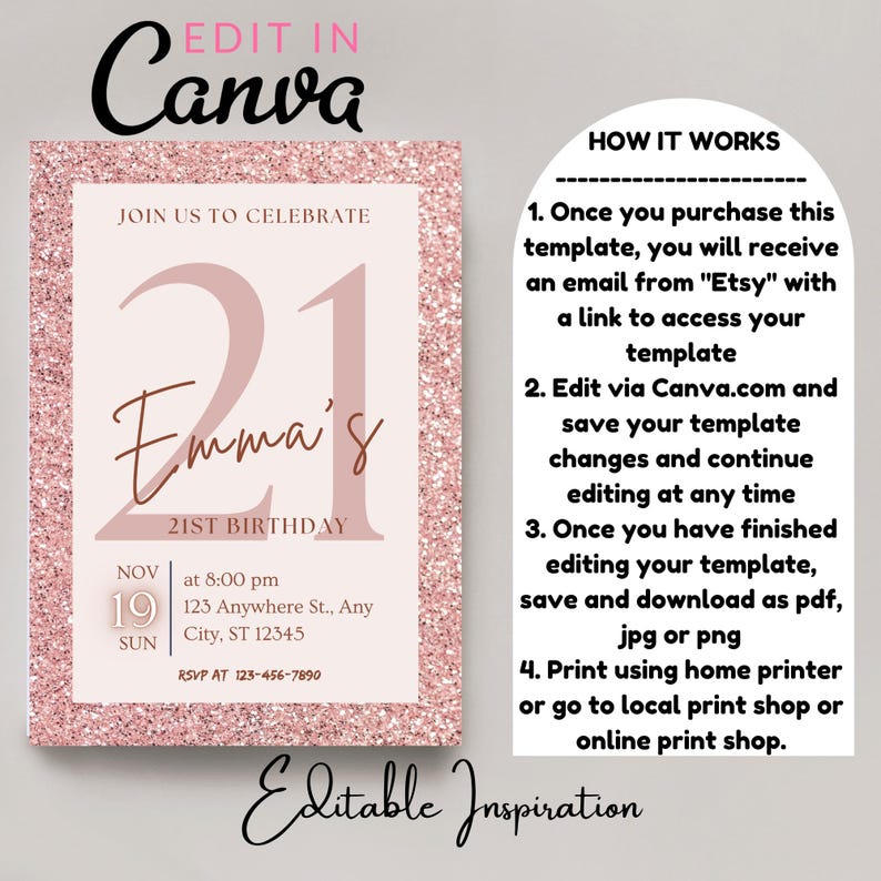Editable 21st Birthday Invitation, Pink Glitter Birthday Invitation ...