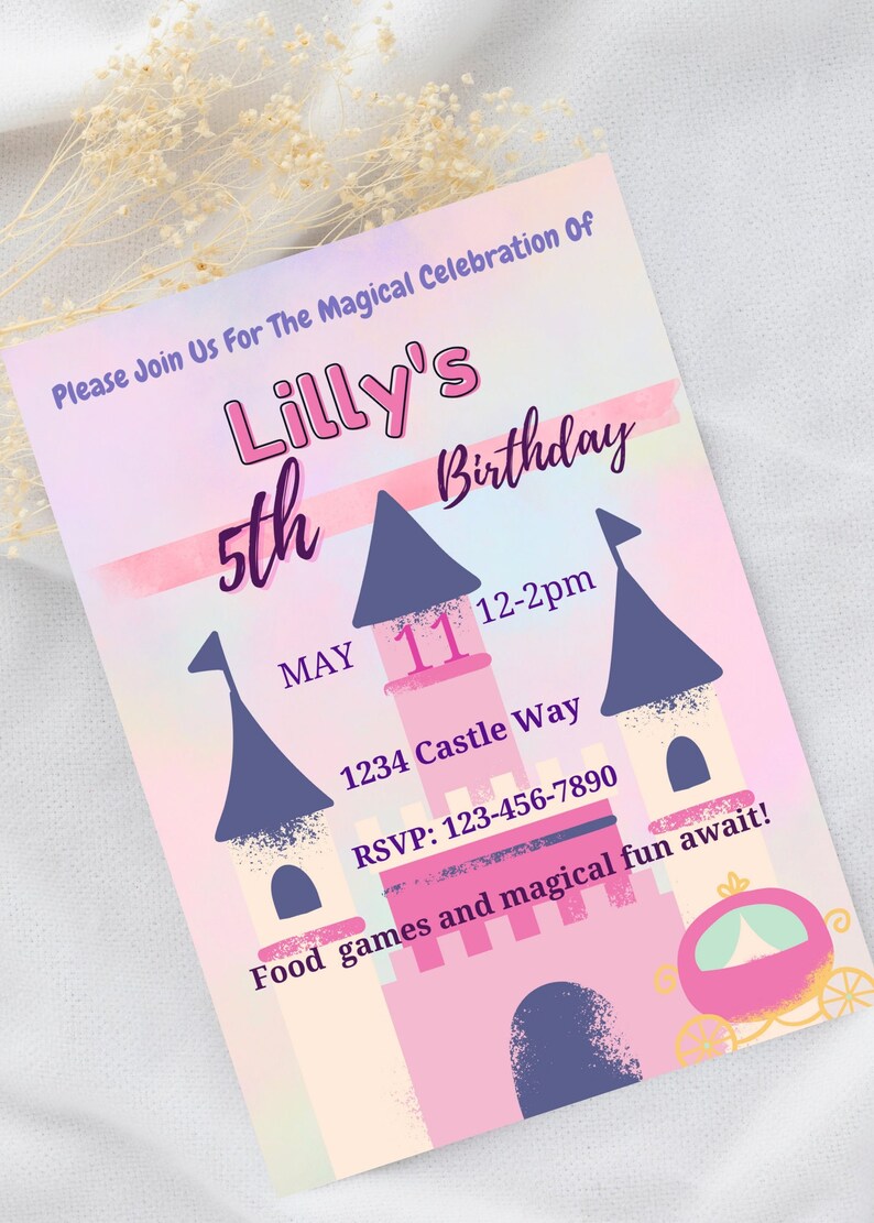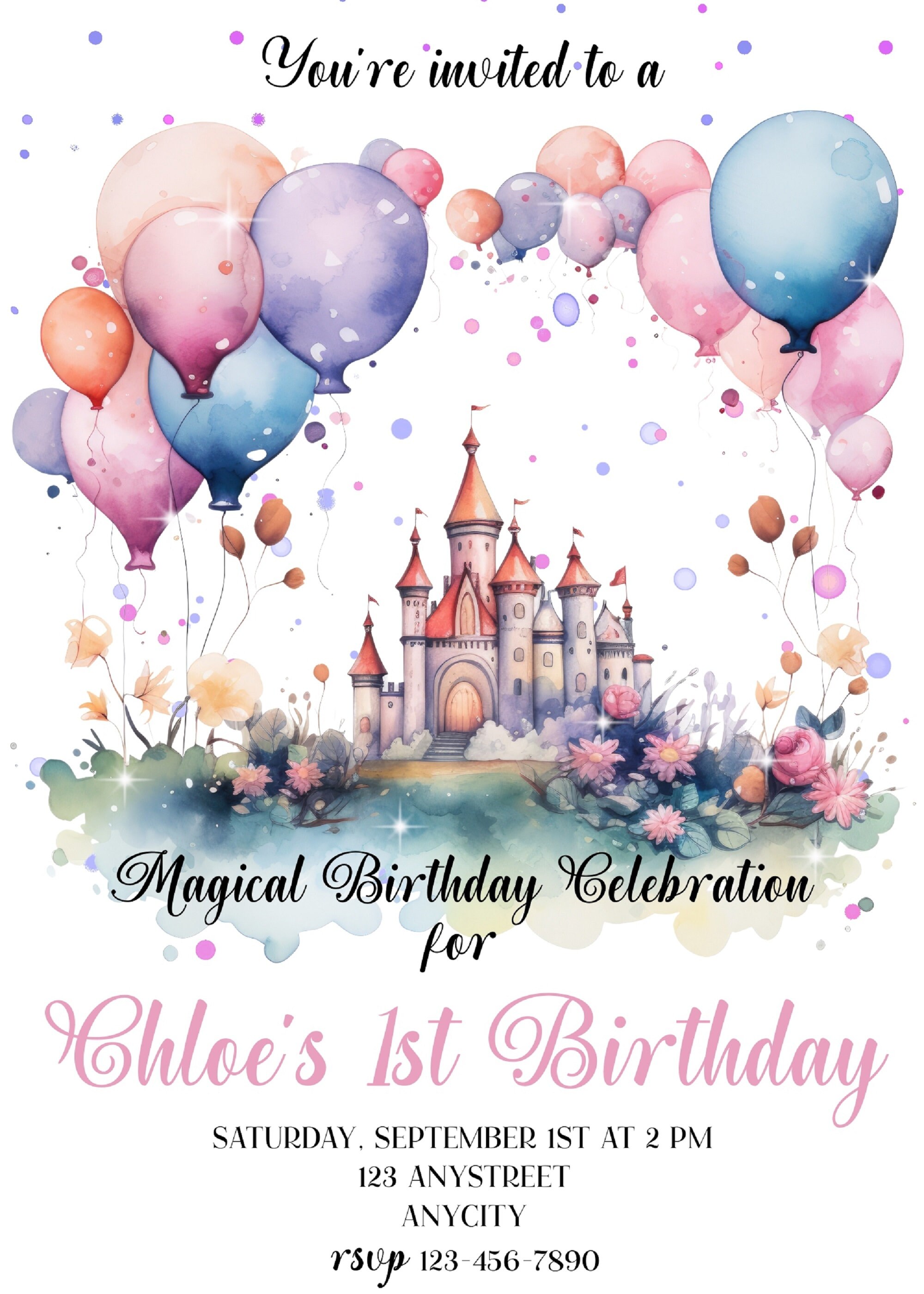 Watercolor Princess Castle Birthday Invitation Card - Editable Canva ...