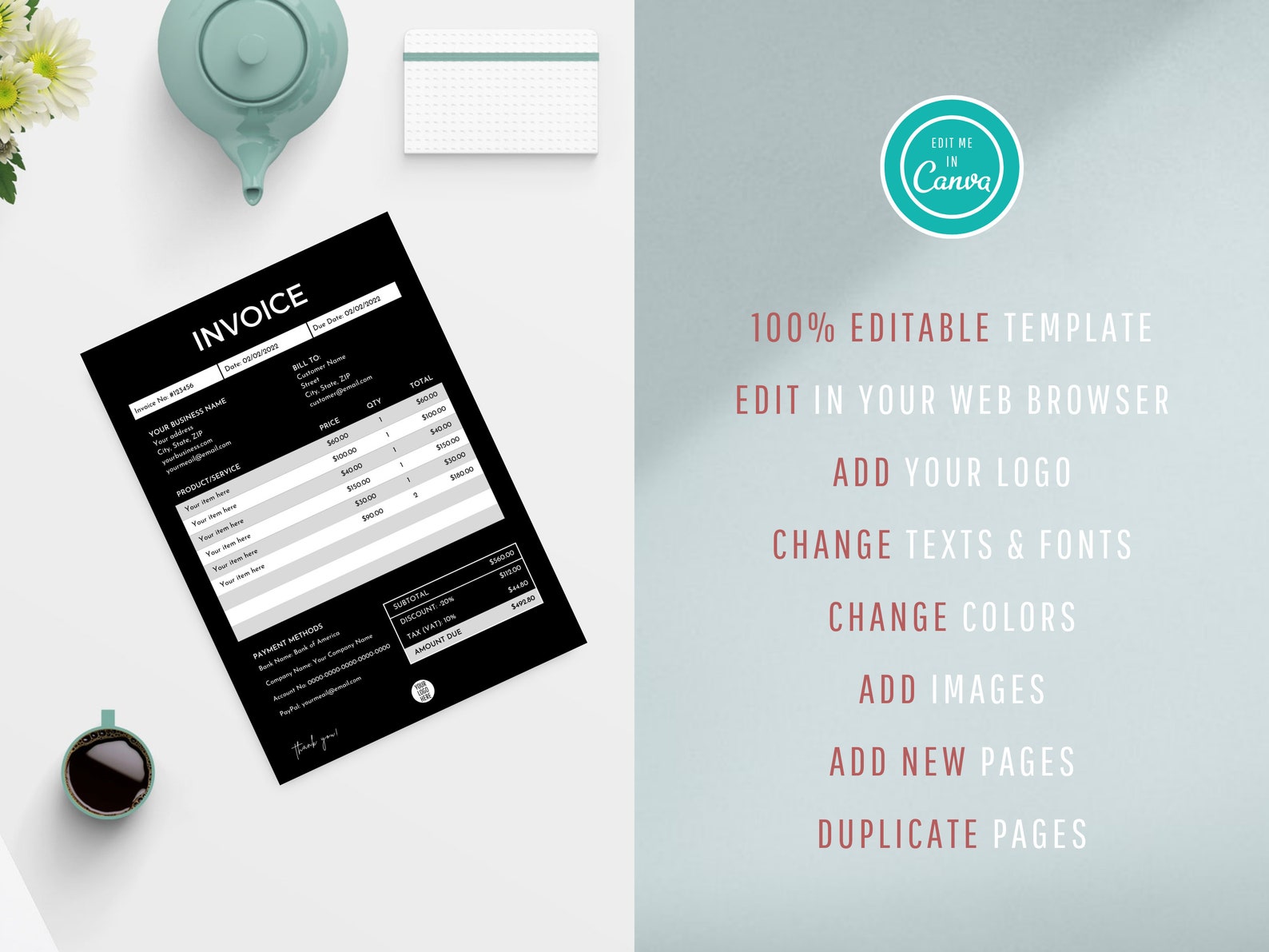 Editable Invoice Template, Canva Editable Template, Invoice Template ...