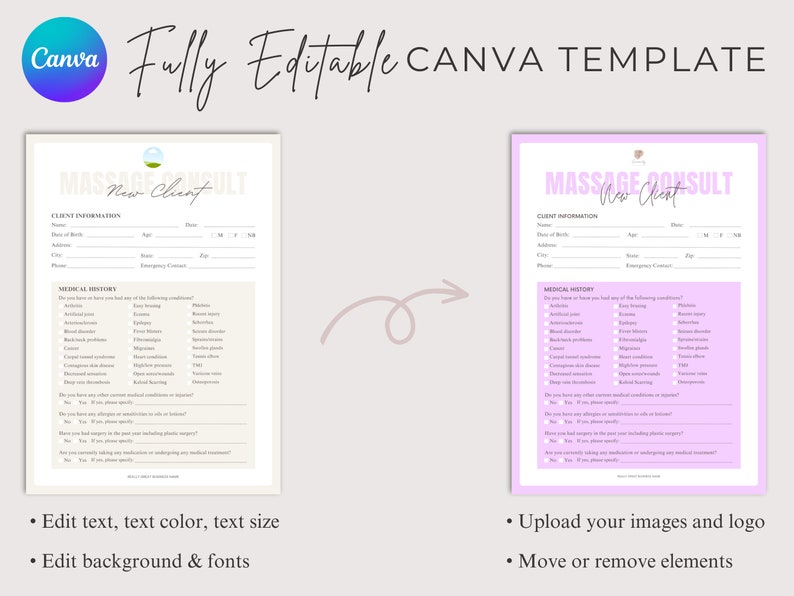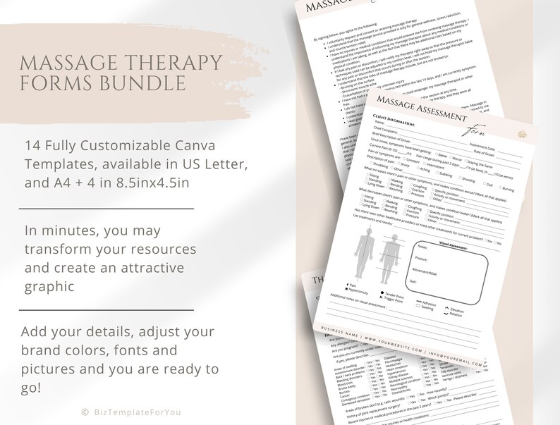 Professional Massage Intake Form Bundle Canva Editable, Massage Therapy ...