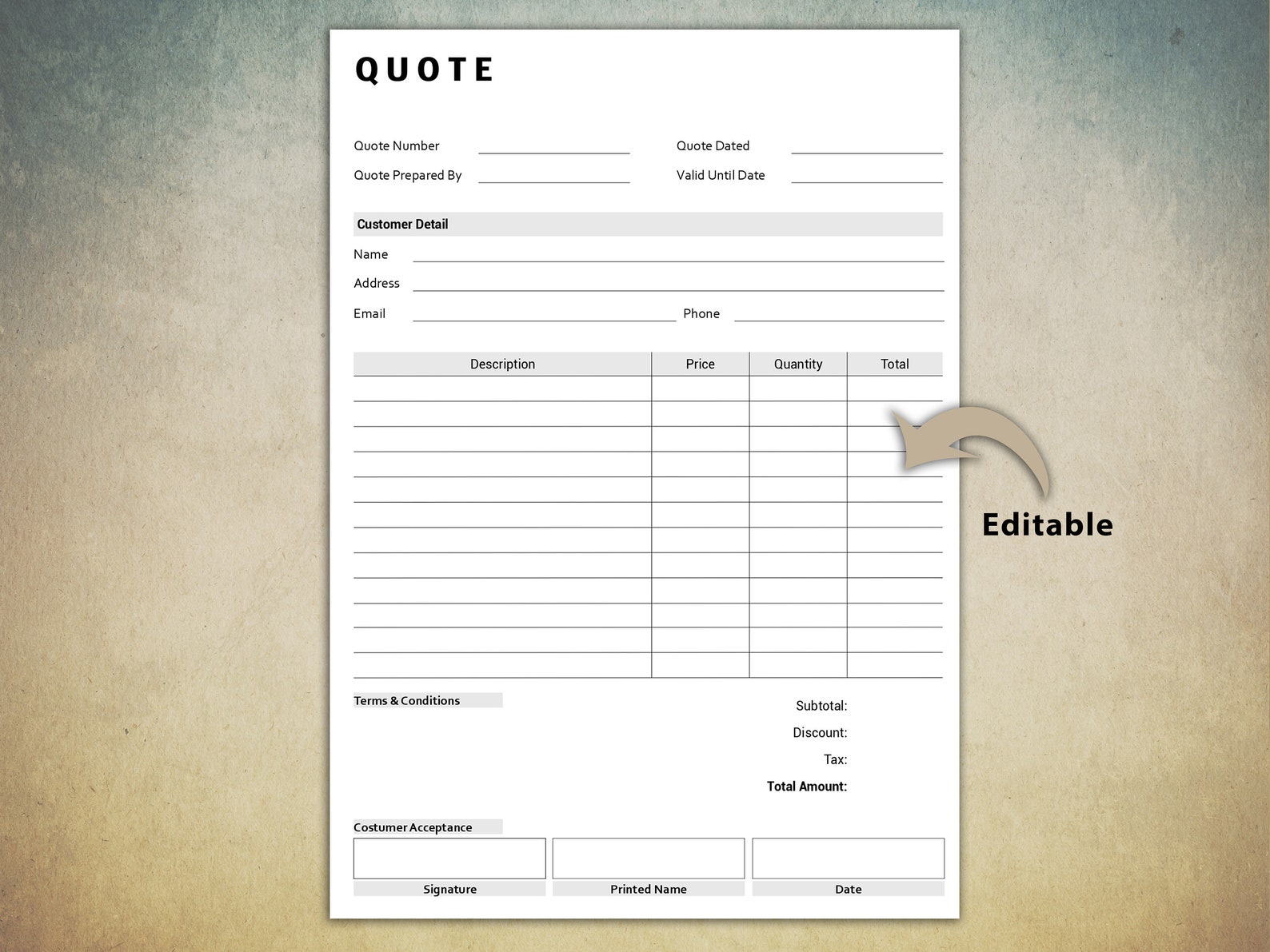 Editable Quote Template EDITABLE Quotation Form Small - Etsy