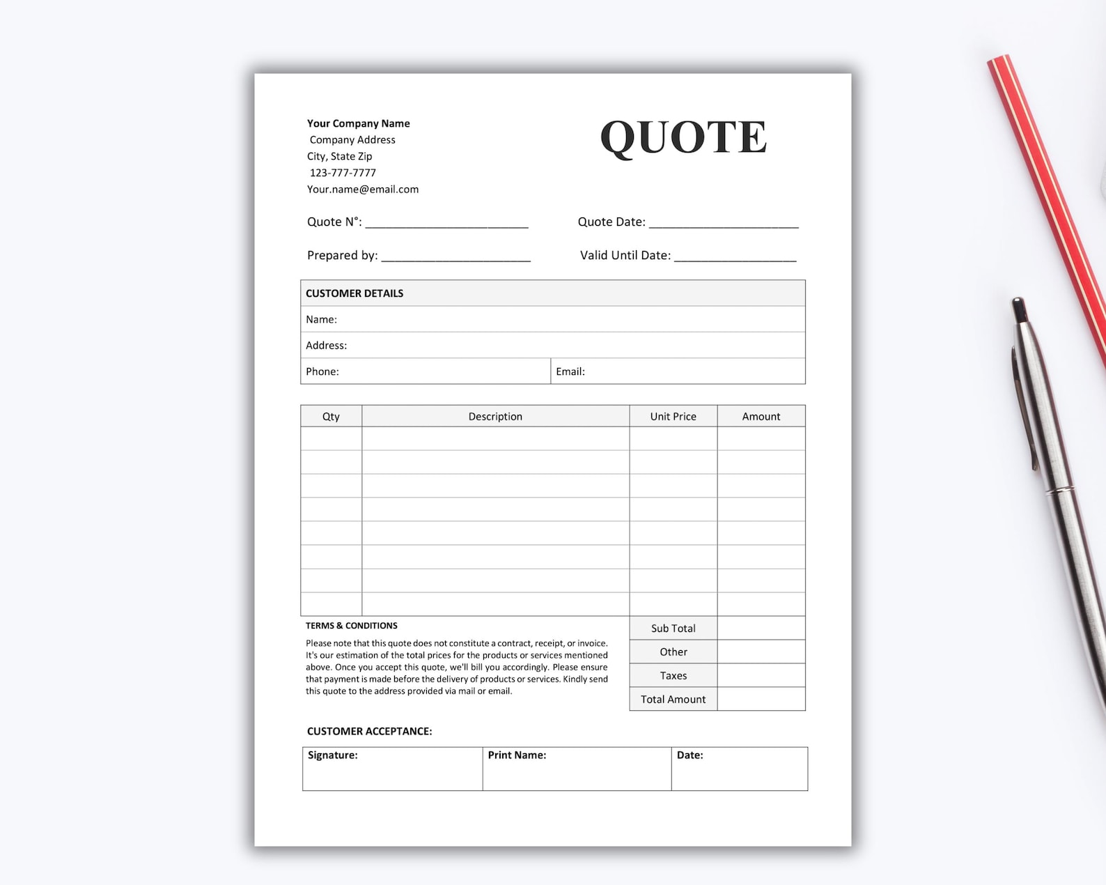 EDITABLE QUOTE FORM, Price Estimate, Quote Proposal, Quote Template ...