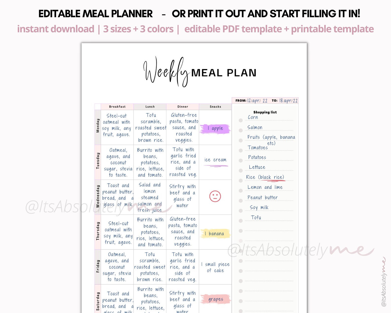 Comprehensive Editable Meal Planner, Weekly Meal Menu Planner, Food ...