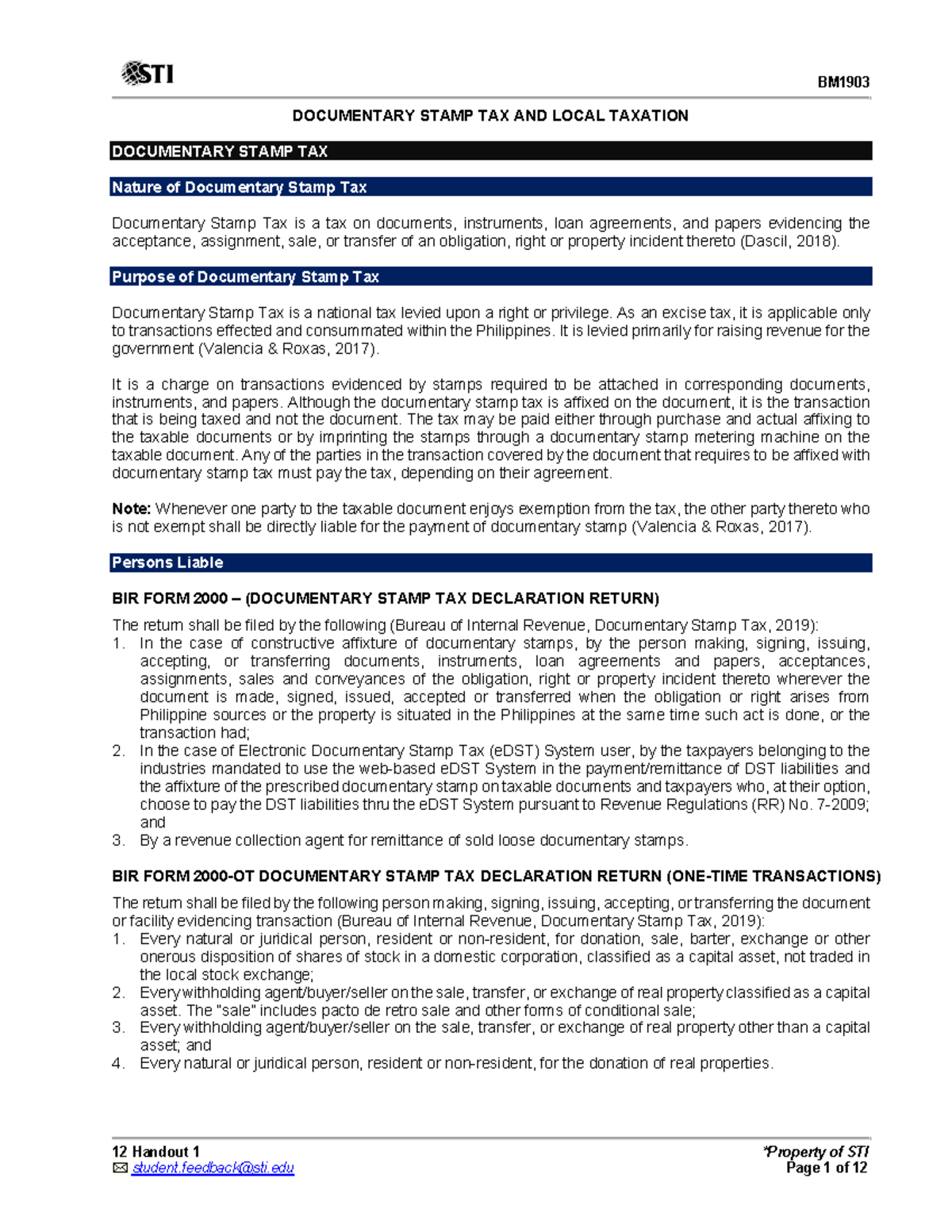 Documentary Stamp Tax and Local Taxation Overview (STI 12 Handout ...