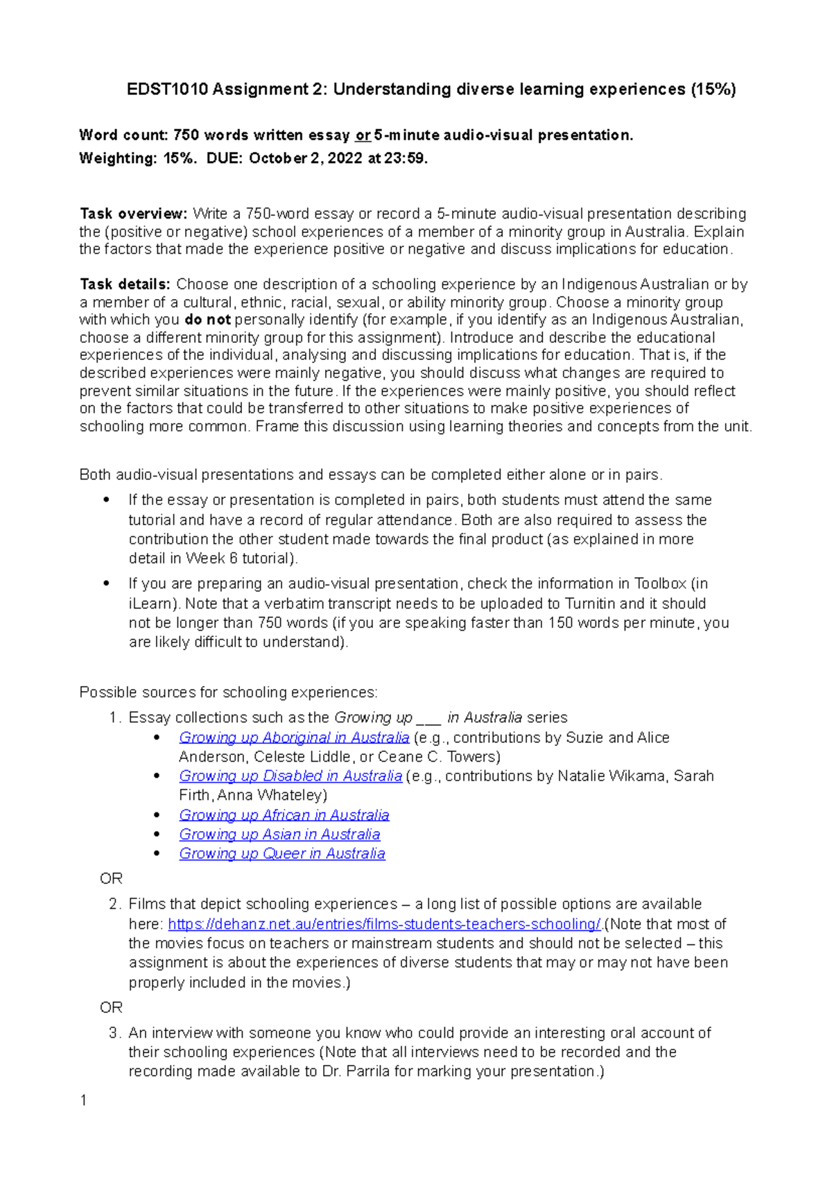 EDST1010 Assignment 2 Instructions 2022 v4 - EDST1010 Assignment 2 ...