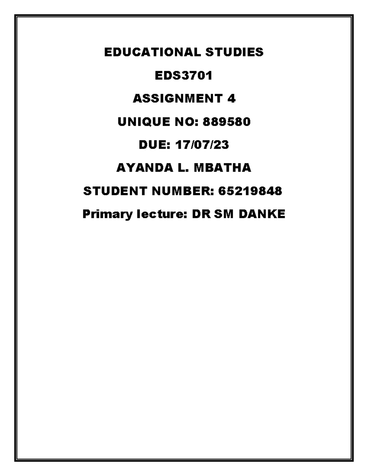 Educational Studies - ASSIGNMENT - EDUCATIONAL STUDIES EDS ASSIGNMENT 4 ...