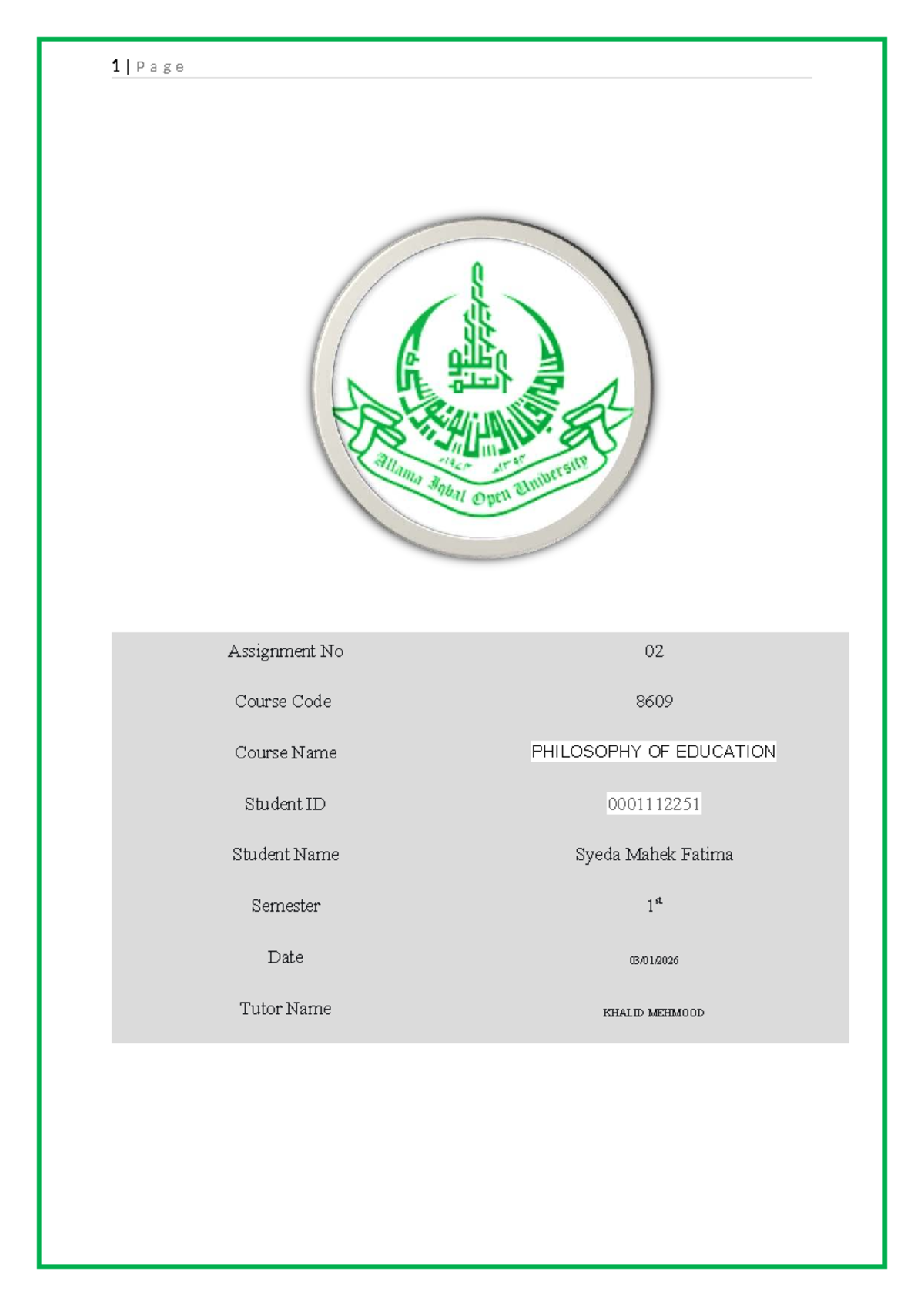 Assignment No 02 - PHILOSOPHY OF EDUCATION (Course Code 8609) - Studocu