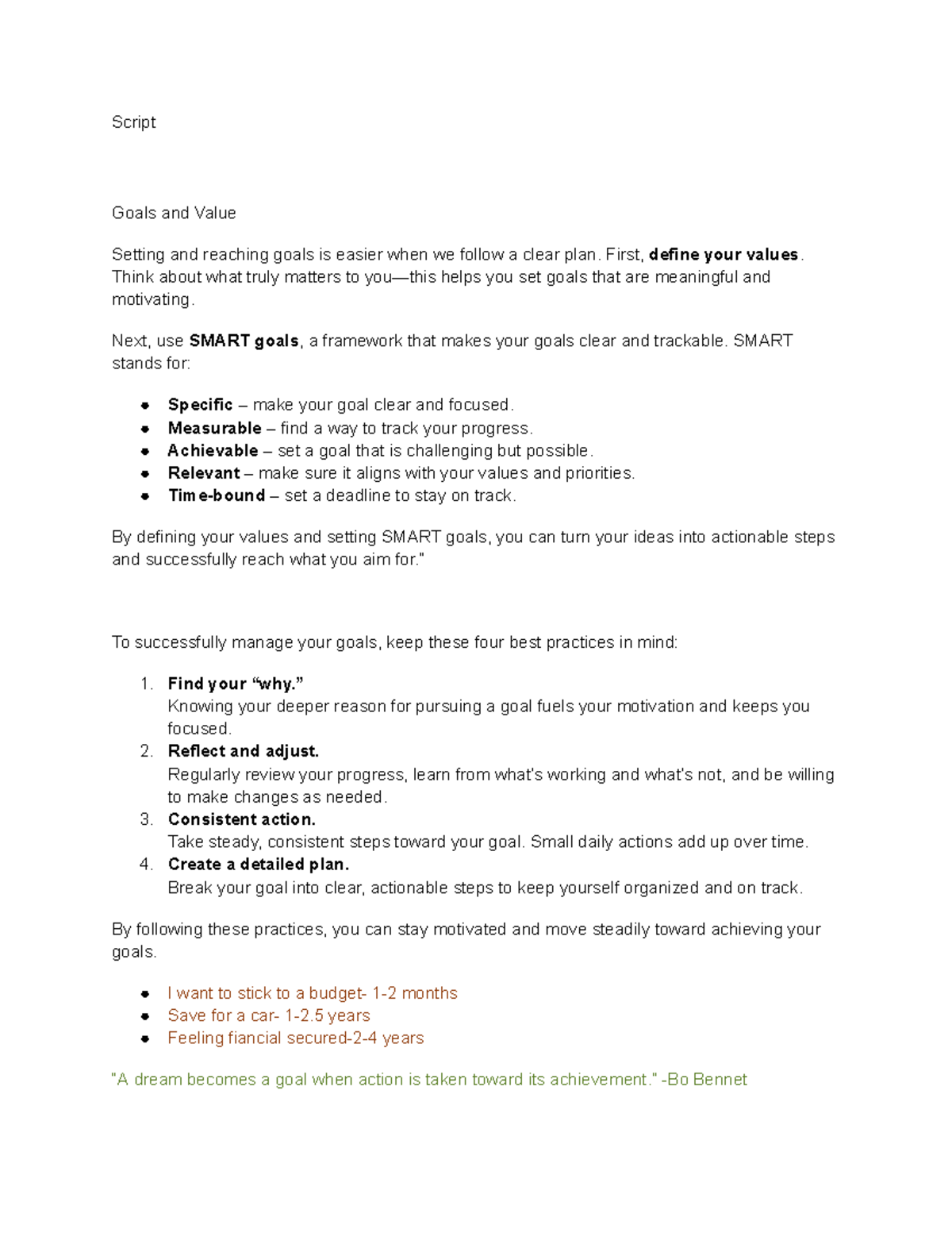 Script - Setting SMART Goals and Effective Budgeting Techniques - Studocu