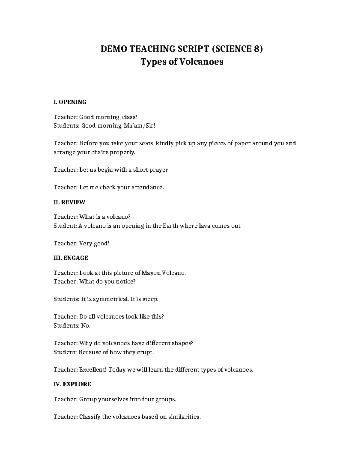 DEMO TEACHING SCRIPT (SCIENCE 8) Types of Volcanoes Lesson - Studocu