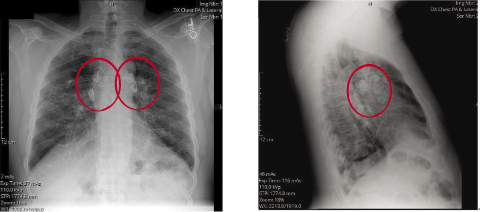 (A, B) Posterior-anterior view and lateral view of chest radiography ...