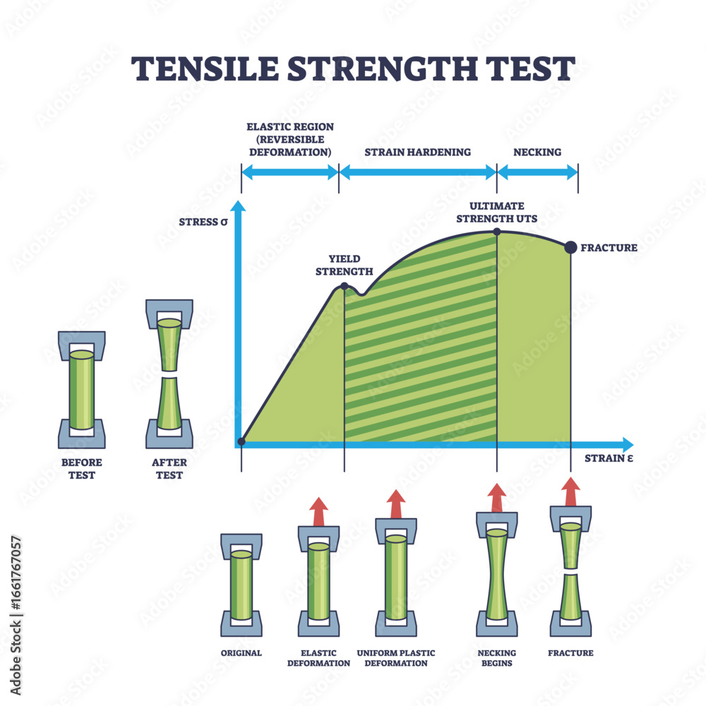 Tensile strength test diagram shows stress-strain curve, specimen ...