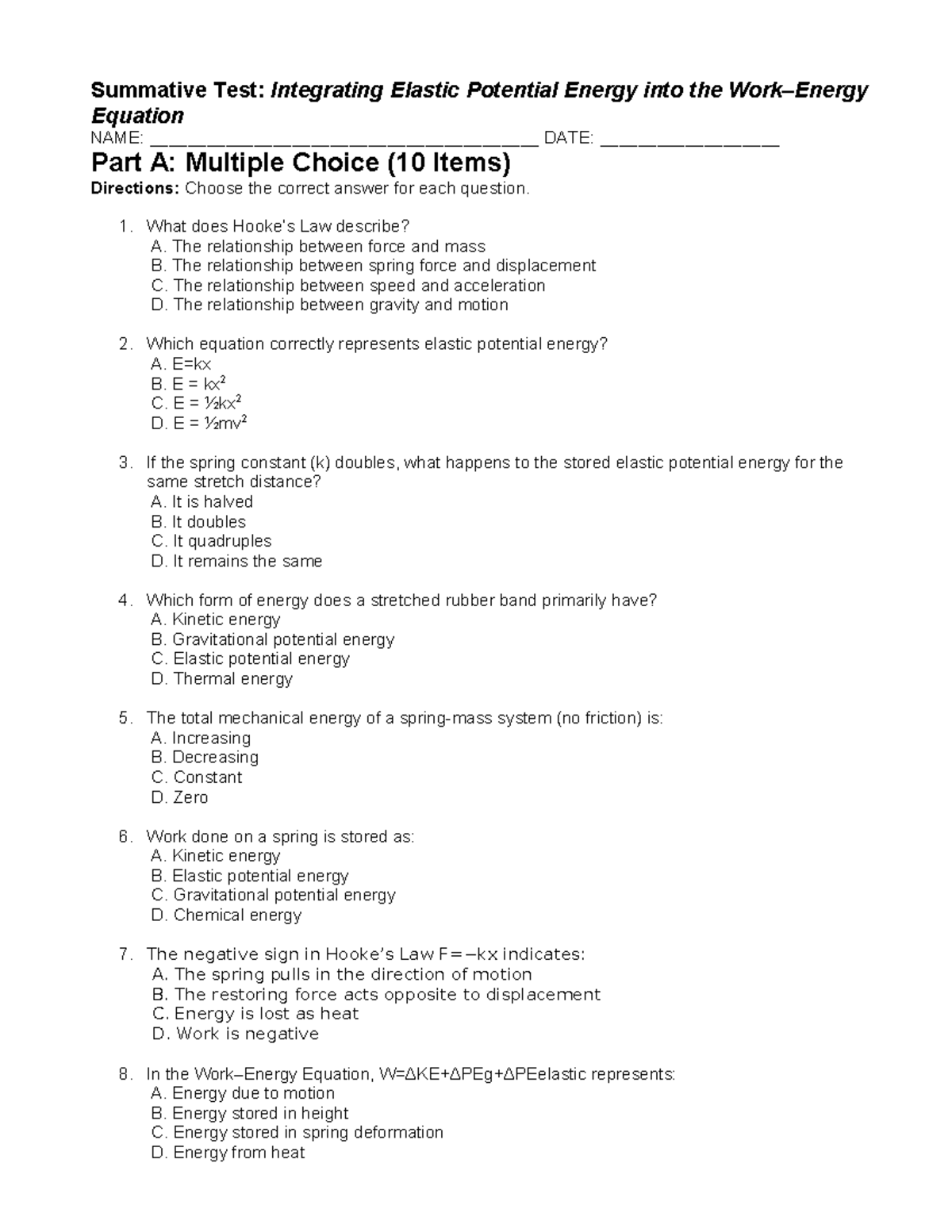 Summative Test: Elastic Potential Energy Concepts and Applications ...