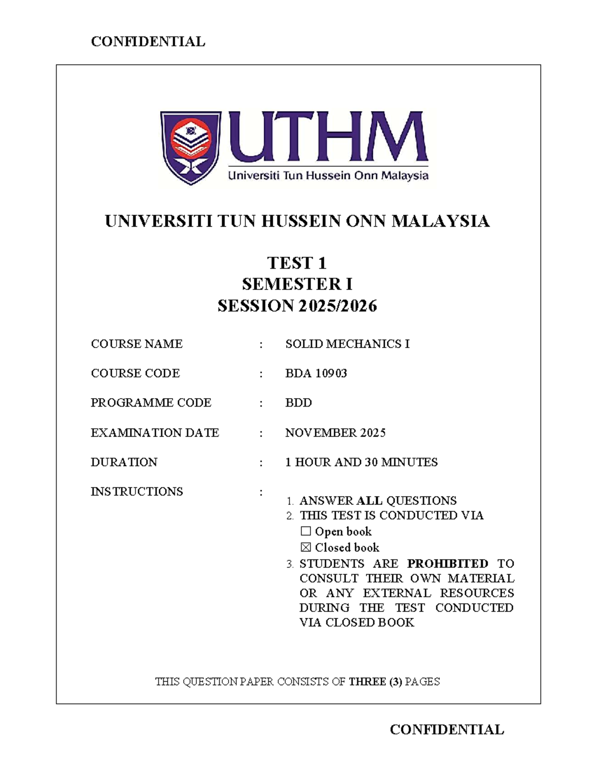 TEST 1 BDA 10903 SOLID MECHANICS I - CONFIDENTIAL - Studocu